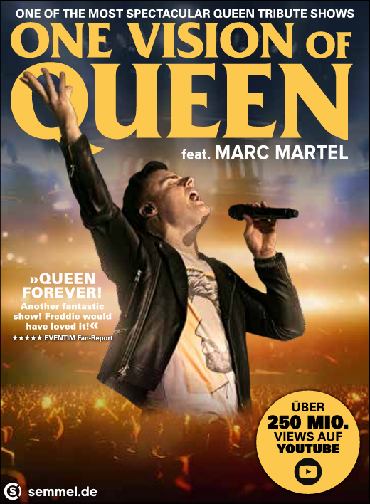 Die stimmliche Reinkarnation des legendären Queen-Sängers Freddie Mercury hat einen Namen: MARC MARTEL. Er gilt nicht nur als eine der außergewöhnlichsten Stimmen der aktuellen Zeit – er versteht es wie kein anderer, die verloren geglaubte Magie eines Queen-Konzerts wieder aufleben zu lassen. „One Vision of Queen“ zollt der Karriere und dem Schaffen Freddie Mercurys höchsten Respekt – und begeistert damit seit fast 15 Jahren eine weltweit gigantische Fangemeinde. Die gefeierte Live-Show hat sich längst zu einer festen Größe in der internationalen Tribute-Szene etabliert. 2027 geht die Erfolgsproduktion erneut auf große Europatournee – mit Halt in einigen ausgewählten Städten, in denen Marc Martel und seine großartige Band auch in der Vergangenheit regelmäßig für ausverkaufte Hallen und Standing Ovations gesorgt haben.